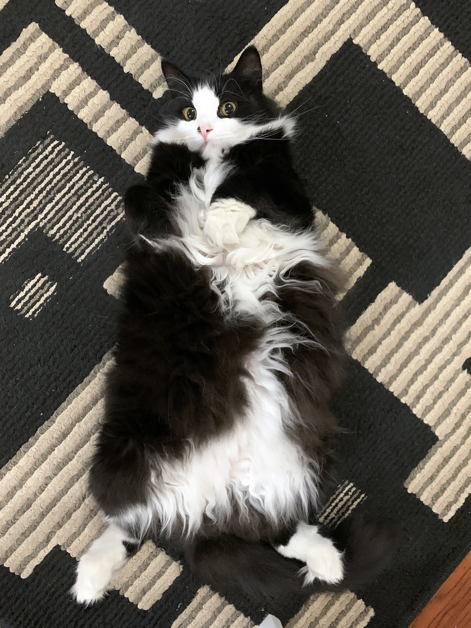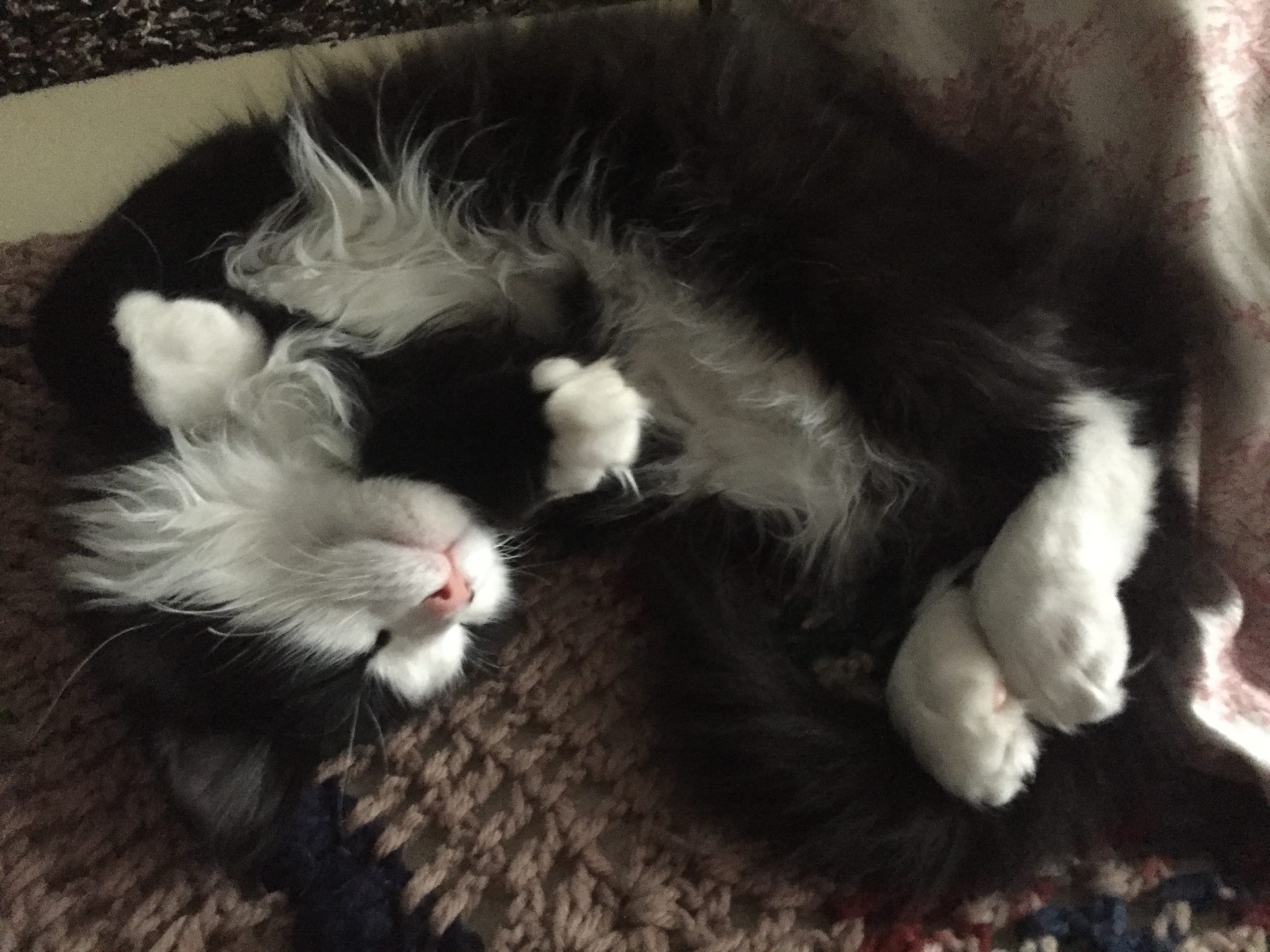 Look at those big curious eyes and little pink nose. He would love to lay like this on our belly, staring up into our face and purring. The “beauty mark” on his nose was one of our favorite distinguishing characteristics of his.
