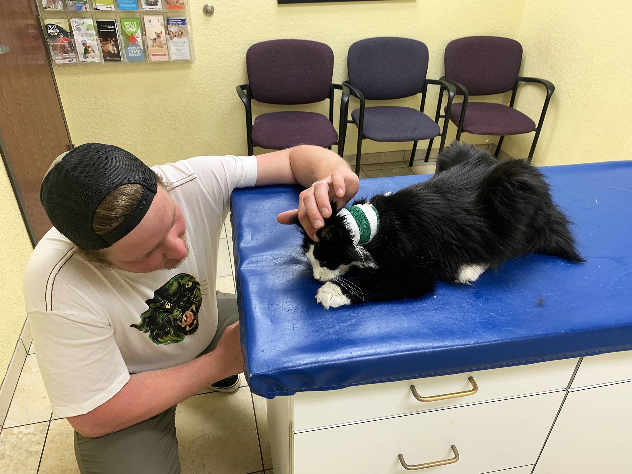 We rushed Moby right after work to Aboite Animal Clinic in Fort Wayne, and were trying to be optimistic thinking he might have a kitty UTI. When we arrived, the nurse came out in a mask (this was during COVID-19) and told us male cats can have problems with UTIs because “their penises are just so teeny tiny!” We rushed to cover Moby’s ears so his self-esteem didn’t get hurt.
